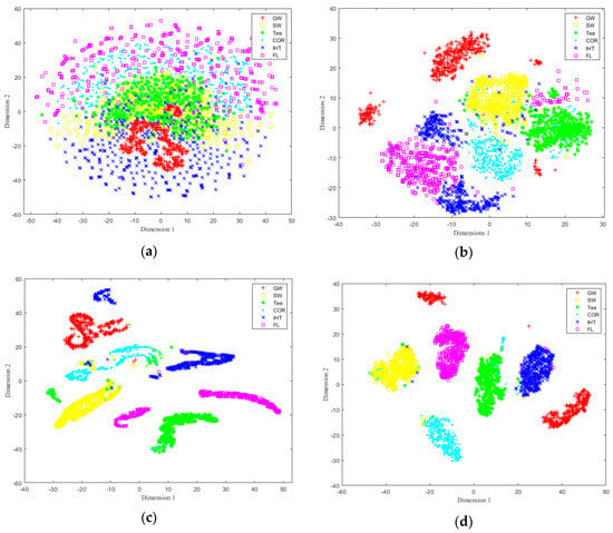 T-SNE of feature identification and classification at different stages. (a) Original training set. (b) Classification results after Conv_RES1 + ReLU. (c) Classification results after Conv_RES2 + ReLU. (d) Final classification results.