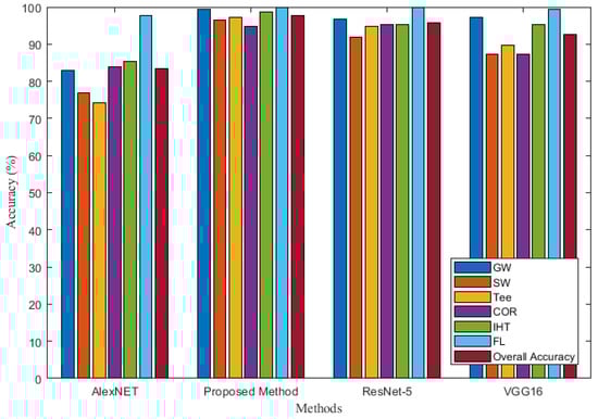 To test and verify the performance of the proposed improved residual convolutional neural network based on VGG16, three methods of deep CNN—AlexNET [49], ResNet-50 [50], and VGG16—were selected for comparison with the proposed method. Comparison results of the four methods is presented in Table 3 and Figure 17. As shown in Table 3 and Figure 17, when the identification is based on Alexnet network, the PRE and recall of SW and Tee reaches lower than 80%. When the identification is performed using the VGG16 network, the PRE and recall of six types corrosion defects MFL signals all improved and reaches higher than 80%. When the identification based on ResNet-50 network, the PRE of GW defect reaches 96.7%, the PRE of SW defect reaches 91.9%, the PRE of Tee defect reaches 94.9%, the PRE of COR defect reaches 95.2%, the PRE of IHT is 95.3% and the PRE of FL is 100%. The PRE of six types corrosion defects by the proposed method are 99.4%, 96.4%, 97.3%, 94.8%, 98.6%, and 100%, respectively. The recall of the six types of corrosion defects by the proposed method are 100%, 97.6%, 95.2%, 95.6%, 98.8%, and 99.4%, respectively. The PRE and recall by the proposed method are the highest compared with the previous three methods. A comparison of the results of the above four identification methods reveals that the proposed method has the highest identification accuracy for the GW, SW, Tee, and IHT defect. It can be found that for the MFL features of a single pipeline, the identification accuracy of COR and IHT is low because the two signal features are similar, especially when the IHT has a smaller size, COR has a larger size, or the external branch pipe feature of IHT is not obvious, misjudgment often occurs. The identification accuracy of FL is the highest because FL signals are the easiest to identify compared to other feature signals.