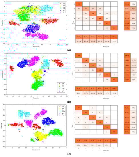 To more intuitively show the feature classification accuracy of different methods, t-SNE and confusion matrix are used to show different classification results. Figure 18 shows the classification results of the pipeline features using AlexNET, VGG16 NET, and ResNet-50. From Figure 18a it can be seen that some of GW, SW, and Tee samples are confused, and IHT and FL samples are not well separated. In Figure 18b,c, the classification effects improve and most samples are effectively separated. From the classified features distribution by the proposed method shown in Figure 16d, it can be seen that by the proposed method the six types of pipeline features can be effectively separated and each type of pipeline feature sample clusters well.