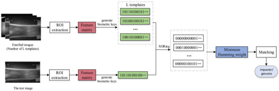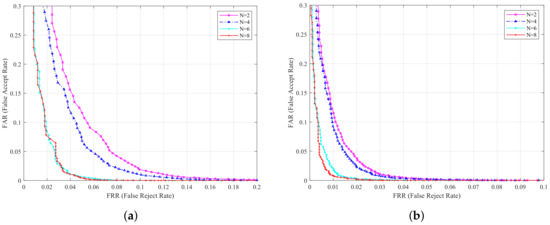 The minimum Hamming distance was proposed to judge the similarity of the enrolled code and the sample code. The proposed method is different from other methods that use Hamming distance matching. In the registration stage, we select binary codes of N images for registration as template, i.e., there are multiple templates saved instead of one, where is obtained from the n-th image by Equation (3). In the matching stage, we calculate the Hamming distance between the sample code and all the enrolled codes, and take the minimum Hamming distance value. The ratio of this value to the length of the codeword is taken as the matching score between the sample code and all the enrolled subjects. This method of measuring similarity can reduce the intra-instance distance and increase the inter-instance distance, thereby increasing the recognition rate.