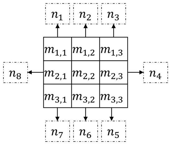 where , 2, 3, 4, is the j-th element in , and is the binary sequence of each small matrix, and is the binary code generated by the whole graph. The pixel value of a point, in the field of any point in the image, is marked as . In Figure 3, we show how is obtained from the small matrix .