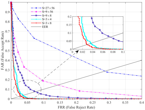 In our previous study [30], we found that for a given image size, the higher the number of blocks, the higher the recognition rate, and when the number of blocks reaches a certain number, the recognition rate does not decrease. Based on this, we mainly explore the effect of the number of blocks on the performance of the proposed scheme in this section. Here, we conduct experiments on the HKPU database. First, we fix the number of templates to six and vary the block size S to investigate the EER values under different S (). The results are shown in Table 4 (Figure 5).