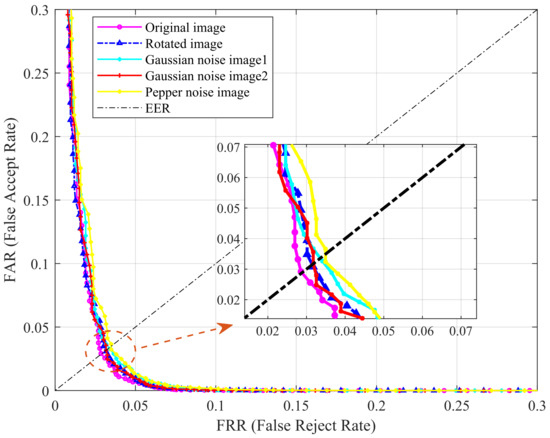 Furthermore, we designed relevant experiments to test the sensitivity of the method, i.e., rotate the image or add noise, and compare the performance with the original image. The tests were performed on the HKPU database, as shown in Figure 7. We added a total of two types of noise, i.e., Gaussian noise and pepper noise. “Gaussian noise image1” and “Gaussian noise image2” in Figure 7 indicate the addition of Gaussian noise at a signal-to-noise ratio of 30 dB and 40 dB, respectively. The results in the figure clearly show that adding noise and rotation have little effect on the performance, which further confirms the robustness of the proposed method.