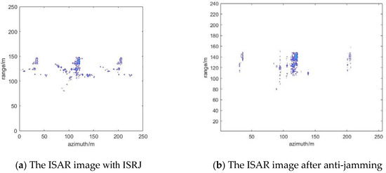 With the increasing types and quantities of targets near space, including aircraft, ballistic missiles, decoys, satellites, near space target, and space debris, inverse synthetic aperture radar (ISAR) plays an increasingly important role in target imaging and identification [1,2]. At the same time, the electronic countermeasures (ECM) technology against ISAR is developing so rapidly with the development of digital radio frequency memory (DRFM). In particular, the interrupted sampling repeater jamming (ISRJ) method based on DRFM can realize deceiving the victim radar by generating amounts of realistic false targets [3,4]. The response speed of ISRJ is fast, and the jamming signal is correlated with the target signal [5,6,7]. Therefore, extensive research of ISRJ has been carried out due to its significant application in electronic warfare.