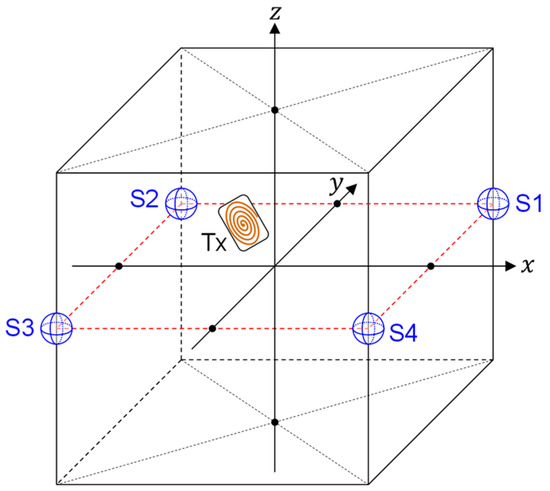 Figure 3. In this study, we assume that the target (TX) exists inside a cubic space of length (2 m) × height (2 m) × width (2 m). However, the dimensions of the cubic space are not fixed since the scaling law holds in localization with artificially generated magnetic fields. Therefore, the results obtained with the 2 m × 2 m × 2 m cubic space can be easily extended to cubic spaces with arbitrary dimensions. For example, it is possible to obtain a predictor function valid for a cubic space of length (4 m) × height (4 m) × width (4 m) by using the same model without increasing training data. Details on this topic are discussed in [