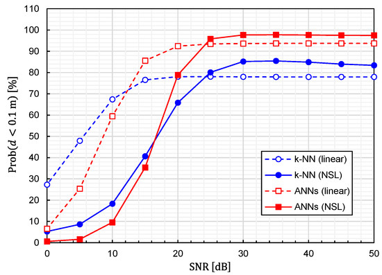 Using Equation (24), we calculated the prediction accuracy as functions of the SNR. The results for