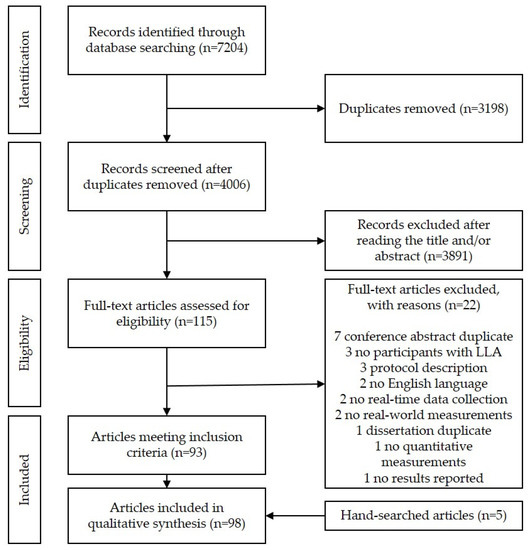 The initial literature search resulted in 4006 records after removing duplicates. Then, 3198 records were excluded after screening the title and abstract, leaving 115 articles for full-text eligibility screening. Of these, 93 articles met the inclusion criteria, and in addition, 5 articles were identified through hand-searching, resulting in 98 articles included in this review. See details of the literature search and reasons for exclusion in the PRISMA flowchart in Figure 1.