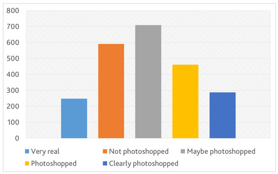 - Does the picture look photoshopped: any noticeable edit or distortion (automatic or manual)? with five possible answers (i.e., from Very real to Clearly photoshopped).