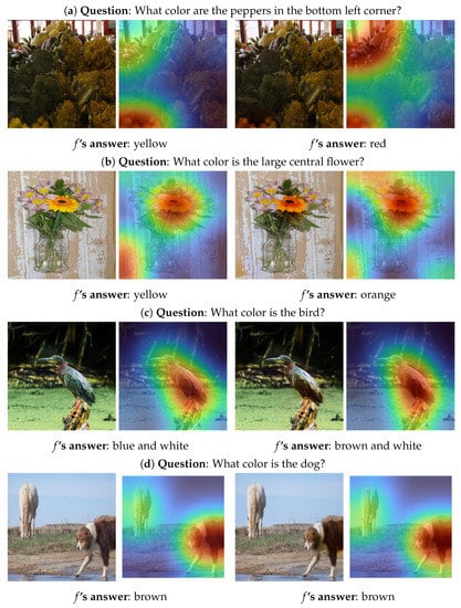 Figure 3 illustrates qualitative results of for color-based questions, where each row represents, from left to right, the original image I, the corresponding map M and the generated counterfactual image and its corresponding map . The rows a–c of Figure 3 show examples of counterfactual images with different answers than their originals with realistic and understandable changes. As can be noticed in some examples such as Figure 3a,b, the VQA system f slightly shifts its attention after the change is applied. This means, that theoretically, f can give a different answer because of focusing on another region after the edit and not because of the edit itself.