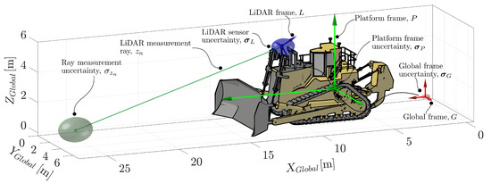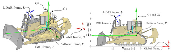 Figure 1 shows the coordinate frames in which variables relevant to the development of the pose estimation system are represented. The global frame is denoted as G. Frame P describes the pose of the tractor in Frame G by a transformation . Sensors are described relative to Frame P: Frame I describes the position and orientation of the IMU; Frame L describes the position and orientation of a LiDAR; and and are the centres of the antennas of two GNSS receivers mounted on the tractor cabin.