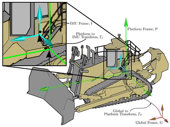 Figure 1 shows the experimental platform considered in this paper. The machine is called a track-type tractor or bulldozer and has applications in agriculture, construction, and mining. In all these domains, tracking spatial pose is needed for technology applications that include production reporting, guidance, and automation.