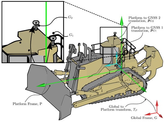 where and are the coordinates of the GNSS antennas in the platform frame (see Figure 4). The measurement vector is the stacked vectors of the antennas’ Cartesian coordinates in Frame G. Equation (42) can be readily extended if a third GNSS receiver were mounted to the platform. The measurement noise, , is assumed to be white and Gaussian with covariance (see Table 3).
