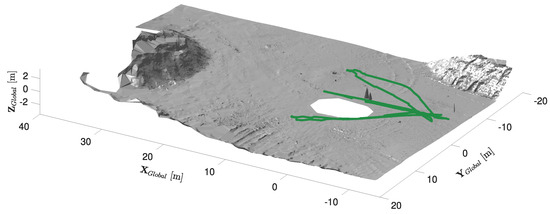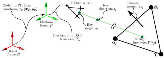 Ref. [33] propose an airborne solution for aiding a navigation system through the use of a large-scale terrain model and LiDAR sensors. Similarly, Ref. [34] augment pose estimates by fitting LiDAR measurements against a known two-dimensional environment model. Refs. [35,36] show how pose estimates of known objects can be obtained from only LiDAR scans by finding the pose that is most likely among the set of all possible poses.