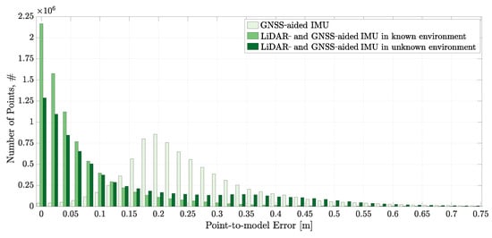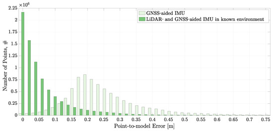 Figure 13 shows that the concurrent terrain and pose estimation system performs slightly worse than the LiDAR- and GNSS-aided IMU solution and significantly better than the GNSS-aided IMU solution. The mean point-to-model error for the concurrent terrain and pose estimation system is . The zero point-to-model error bin is the largest bin, with the error distribution extending to higher point-to-model error values.