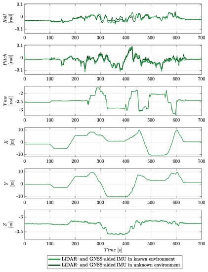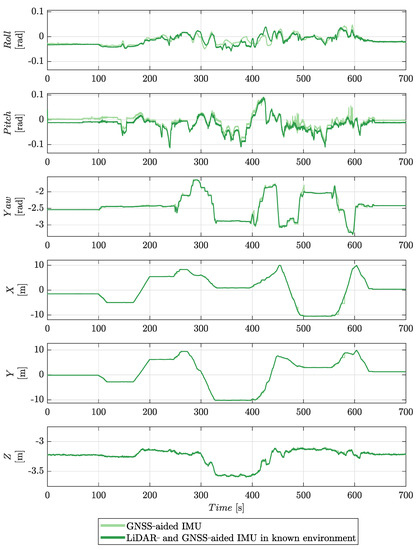 The estimates of the six degrees of freedom of the platform’s pose are shown in Figure 15. The solution generated without a priori knowledge of this environment shows some deviation in both roll and pitch when compared to that obtained using a known environment. The forward-looking orientation of the LiDAR sensor clearly stabilises the pitch estimate; the roll estimate is similar to the GNSS-aided IMU solution. A wider three-dimensional scan is expected to yield better stabilisation of roll. Equally, better roll estimates could be achieved by increasing the space between the GNSS antennas. The yaw, x, y, and z degrees of freedom are similar to those estimated when the environment is known. Overall, the results demonstrate the effectiveness of the approach.