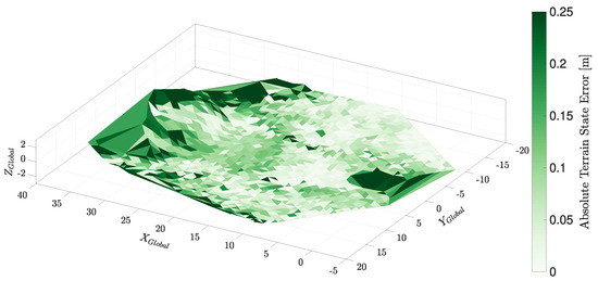 The error of the triangulated state mesh constructed whilst localising the platform. Here, the error of the terrain model is generally less than ; however, there are some regions of larger error. The terrain estimates pictured here are fit for the purpose of terrain mapping in the use case this paper targets.