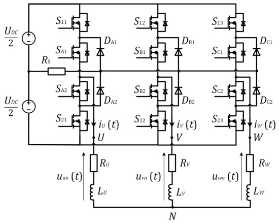 Some research has been performed on three-level and/or multi-level inverters. An interesting work was performed in [19], where the authors described an application where the three-level inverter was used for driving a five-phase electrical motor. However, the three-level (or multi-level) converters have recently been the subject of research work due to their good properties (voltage stress on the transistors), where the authors studied the control and design of the motor drives and PFC rectifiers [20,21,22,23]. In [24], a voltage injection method was proposed to solve problems with single-shunt current measurement applied to the neutral-point-clamped three-level inverter, which relocates the original voltage reference in the boundary area to the normal operating area in the voltage plane.