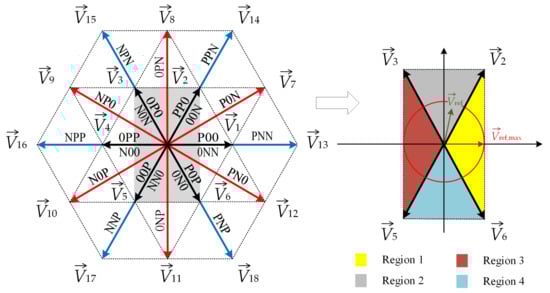 As mentioned above, the proposed method is applied for low modulation index values, where SVM and SVM-shift methods [25,26] cannot be applied because the times between the two SVM signal edges are too short. Figure 2 shows a vector diagram for a three-level inverter with a marked area, which is covered with the proposed method. The switching states and vector notation are indicated in Table 1, where and . It can be seen that, instead of a hexagon, the shape that is formed from the BVV ends is a rectangle. The rectangle can be divided into four regions, as shown in Figure 2. Using the proposed method, an arbitrary voltage vector can be generated anywhere inside the rectangle shown in Figure 2. The maximum arbitrary voltage vector that can be generated using the proposed SVM method is shown in Figure 2 as . This can be achieved when the theoretically maximum modulation index for the proposed SVM method is applied, which can be calculated as follows: