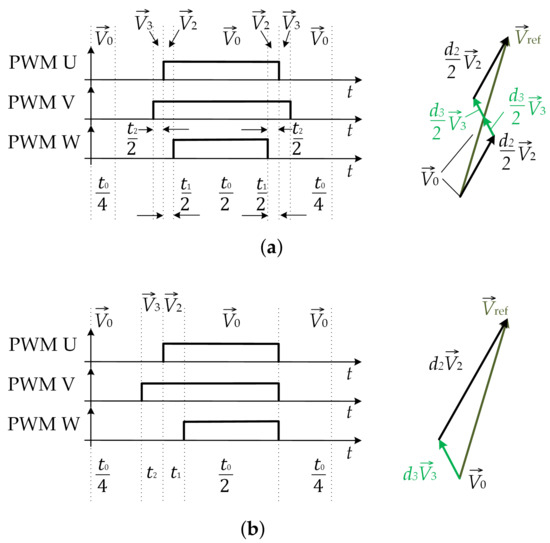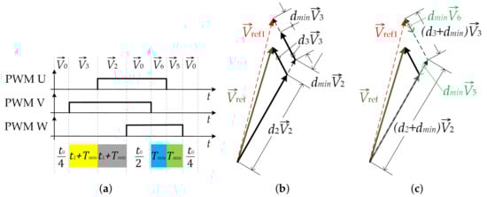 To generate an arbitrary voltage vector as shown in Figure 2, the pattern based on SVM can be used (Figure 3a). It can be used to generate an arbitrary voltage vector, but when times or are shorter than , then the precise current measurement cannot be achieved without additional modification due to the insufficient time widow needed for measurement. The time duration between the two edges is long enough if it is longer than , which depends on the hardware design, dead time, and settling time [26], and can be evaluated as follows: