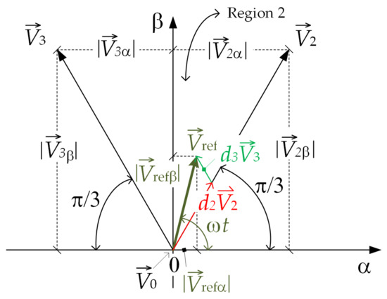 therefore, an arbitrary voltage vector positioned inside Region 2 can be expressed as a linear combination of two RBVVs and and zero vector (with a length of zero) as follows: