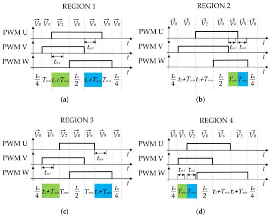 Proposed SVM pattern for low modulation index values: (a) Region 1; (b) Region 2; (c) Region 3; (d) Region 4.