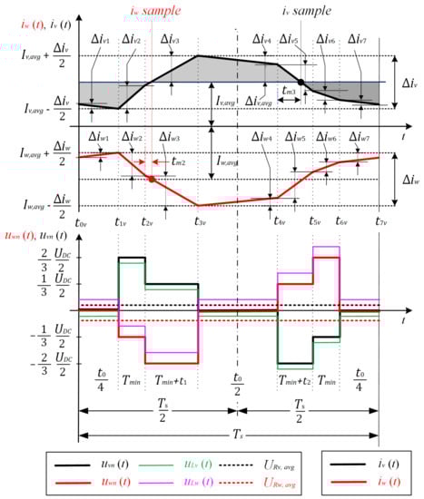 Current waveforms for and shall be determined in order to calculate the exact sampling position. As an example, while the reference voltage vector is positioned inside the first region, the characteristic voltages and phase currents are shown in Figure 8. According to the second Kirchhoff law, the phase voltage can be determined as follows: