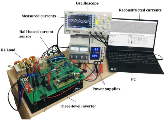 The designed three-level inverter, with three-phase R-L load with 1 and 560 , was tested under laboratory conditions. The test-bench system is shown in Figure 9. The DC-link voltage , the switching frequency , and the minimum time window were considered as 24 V, 16 kHz, and 4.5 , respectively. The single-shunt 5 m was placed in the DC-link, as shown in Figure 1, and the current measurement circuit was designed for a 16 A maximum current measurement range. A Texas Instruments control board based on TMS320F28335 was used to implement the proposed method. The proposed method was designed using the model-based design approach using MATLAB/Simulink with a measured CPU load of 25 (40%) including the additional debugging functionalities. The designed algorithm can be further optimized, and the CPU load can be reduced. Floating-point or fix-point DSP, with enough PWM outputs and fast ADC with the flexible triggering and synchronization options, can be used for the algorithm implementation. Through serial communication, reconstructed currents were obtained using an X2C Scope within the runtime. To verify the single-shunt current reconstruction measurement results, these were compared with the reference currents measured with the oscilloscope.