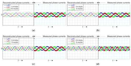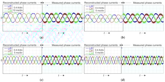 Figure 10 and Figure 11 present the reconstruction results for the low modulation index operation and , respectively. As a reference measured signal, the current signals obtained by the three Hall-sensors and the oscilloscope were used. The measurements were performed at four different load frequency requirements, at 25 Hz, 50 Hz, 75 Hz, and 100 Hz, respectively.
