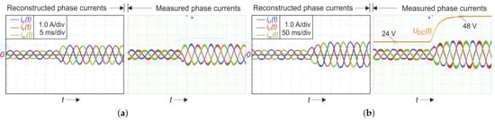 where represents the measured average peak phase current value (by the Hall sensor and scope) and represents the reconstructed peak phase current value. With a higher modulation index, the measurement error was reduced, due to the current measurement range, which was designed for a maximum 16 A. Furthermore, it can be observed that the occurrence of current spikes was removed from the reconstructed signals. Figure 12 verifies the proposed algorithm behavior under the transient condition state. Figure 12a shows the case when modulation index changes leap from to , while the load frequency and DC-link voltage were 100 Hz and 24 V, respectively. Figure 12b shows the case when DC-link voltage changes leap from to , while the load frequency and modulation index were 10 Hz and 0.075, respectively. The experiment (Figure 12) confirmed the proposed SVM algorithm’s operation under the transient conditions.
