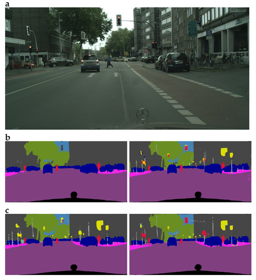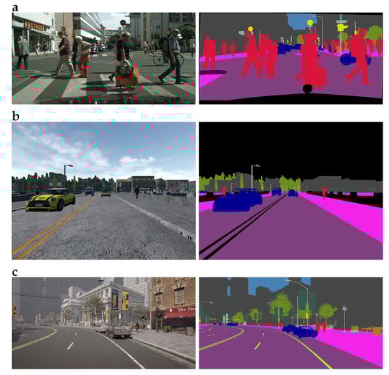 Sample images and their segmentation masks from the datasets: (a) Cityscapes dataset; (b) MICC-SRI (Media Integration and Communication Center–Semantic Road Inpainting) dataset; (c) CCM (Cityscapes-CARLA Mixed) dataset. Note that (a,c) are not to scale with respect to (b), as the actual resolution of (a) and (a) is 1024 × 2048 pixels vs. 600 × 800 pixels for (b).