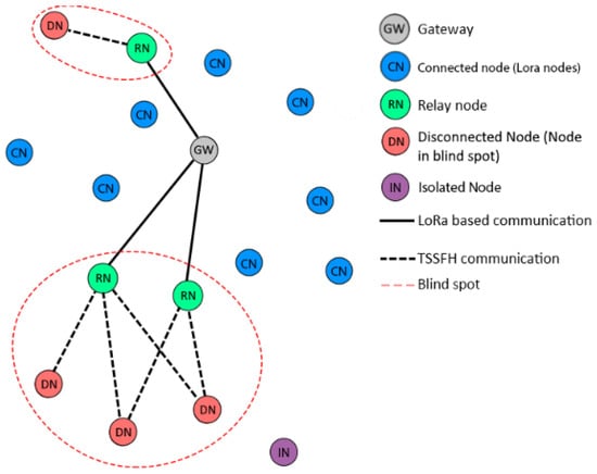 With our TSSFH proposal, a node in a blind spot (i.e., outside the GW coverage area due to distance or channel impairments) can use multiple SFs to communicate with a node in a GW range, with the latter acting as a relay between the disconnected nodes and the GWs. The main purpose is to deliver a packet to the relaying node (RN) using the proposed TSSFH MAC protocol. This results in a two-hop LoRa-based network, as shown in