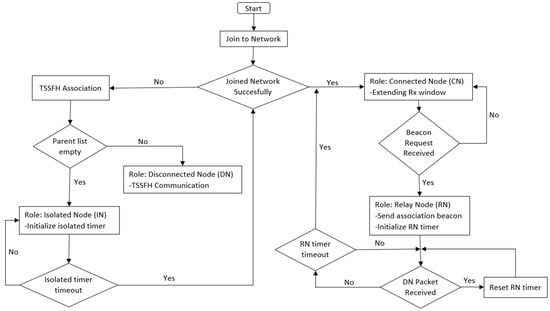 Once the association timer expires, each node checks its parent list, and when at least one parent is available, the node takes the role of DN. The DNs send data packets using the TSSFH communication mechanism. Nodes that cannot find a parent during the TSSFH association process take the role of isolated node (IN) and turn off for a given period before trying to obtain access to the network again.