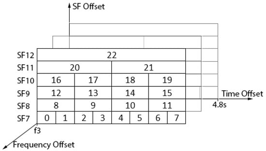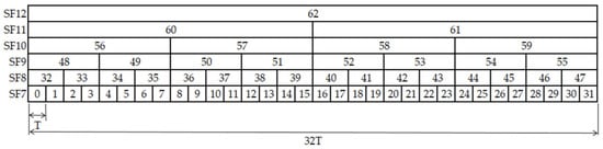 To design the proposed TSSFH, let us assume that the transmission of a packet, using SF7, has a time on air (ToA) of T seconds. Considering LoRa’s ADR, this means that using SF8, it will take about 2T seconds, about 4T for SF9, and so on, up to SF12, which takes about 32T seconds. Ensuring T is big enough to guarantee any LoRaWAN packet transmission, we can define a frame structure with a duration of 32T seconds. This means that nodes hopping to different SFs can find a different time-slot structure, as shown in