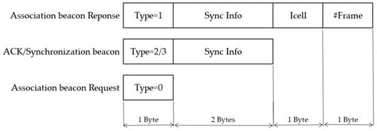 Figure 5. The type field depends on the TSSFH message type: 0 (association beacon request), 1 (association beacon response), 2 (ACK), and 3 (synchronization beacon). As is explained further later in this section, the cell index (