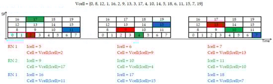 All the RNs use the same vector of cells, Vcell, which is shared among the whole network. The vector is stored in the node’s firmware during configuration. The following example shows the full vector of 23 cells when the six SFs are used: Vcell = {0, 8, 12, 1, 16, 20, 2, 9, 13, 3, 17, 22, 4, 10, 14, 5, 18, 21, 6, 11, 15, 7, 19}. Considering that higher SFs increase the time on air, duty cycle, and energy consumption, and that SF11 and SF12 only contribute three cells, cells 20, 21, and 22 were removed from the vector list.