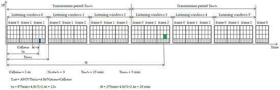 Icell) that is shared with their DN neighbors during the association process. This allows nodes in blind spots to predict the cells on which their potential relaying nodes will listen during their listening windows, because the nodes scan the vector following a round-robin strategy. Listening windows implement a multi-frame structure, in which every frame can have a maximum of 20 cells (using SF7–SF10), according to the number of SFs in use. As a result, multiple RNs can listen at the same time, albeit using a different SF, or on the same SF, but at different time slots.