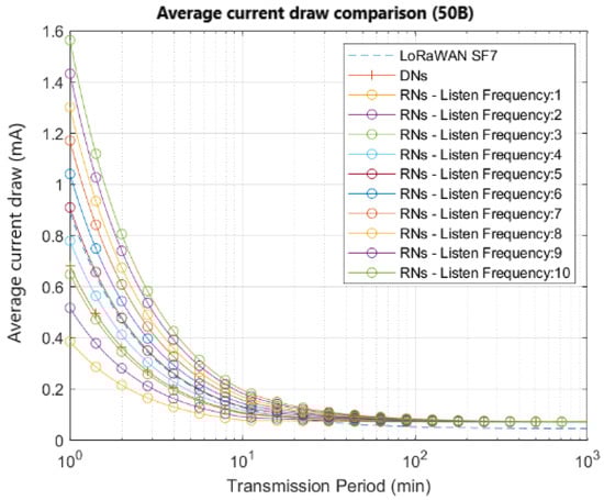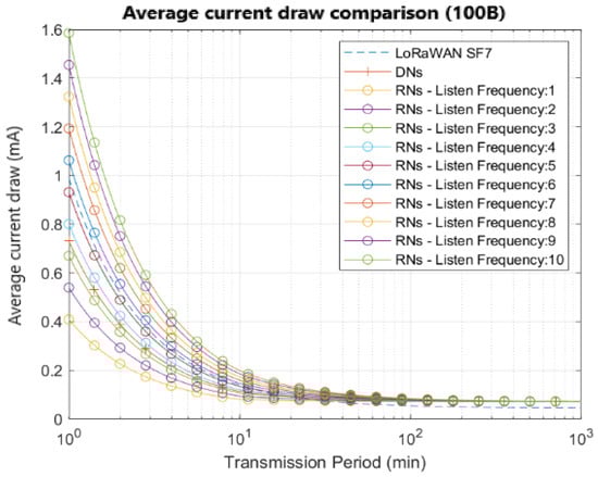 Figure 9 shows different curves corresponding to the average current draw for several listening frequencies, considering an application with 100 bytes of payload length. The behavior is shown for a range between 1 and 10 listening windows per transmission period, the latter being represented in a range between 1 and 1000 min. To facilitate the comparison, we take as benchmark the curve in the dashed line that depicts the LoRaWAN single-hop average current draw for SF7, considering acknowledged transmission [