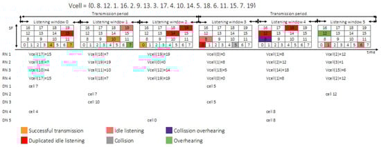 NLnPerTx = 3), each with a single frame. One of the nodes in a blind spot, DN1, achieved a successful transmission in the first transmission period, as no other node was using cell 7. However, in the second transmission period, a collision occurred, as DN3 was also using cell 5. The relaying nodes RN1 and RN4 were overhearing, as both were using the same cells for listening, duplicating the reception of messages transmitted by DN2 in the second listening window. The collision originated by DN4 and DN5 during their transmissions in the second transmission period also caused overhearing, as RN1 and RN4 were listening in the same cell 8 (making duplicates of either transmission or collision). As expected, there was a significant amount of idle listening, as each relaying node listened three times in every transmission period, but some (RN1 and RN4) were duplicated, potentially causing overhearing, a situation that was repeated in every listening window.