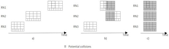 Figure 13a shows. Asynchronous behavior (i.e., a lack of coordination) between the RNs can cause a typical collision between nodes that are transmitting to different RNs in a blind spot, as shown in