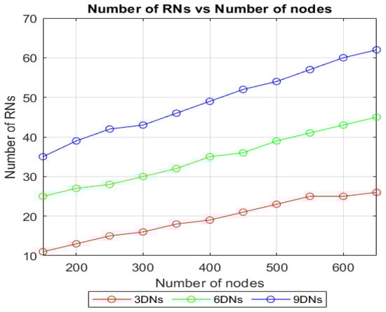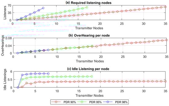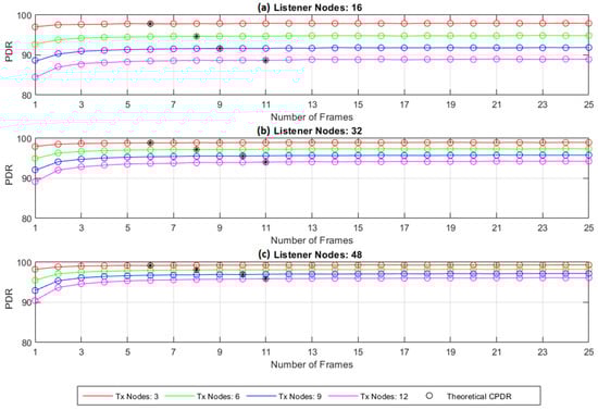 Figure 13c. The analytical results of the PDR shown in Equation (18) did not consider the collision probability generated by the RN or CN transmissions in the single-hop network (e.g., LoRaWAN). Estimating or simulating collisions between LoRaWAN (or another MAC protocol used in the single hop network) and TSSFH is more complex, so it is also addressed in the next section, using OMNeT++ simulation scenarios.