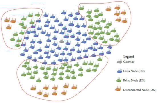 Figure 1. The advantages of using multiple SFs are twofold: (i) when a node is disconnected within a blind spot, it may reach a relaying node using a lower SF, but it may need a higher one; and (ii) the use of multiple SFs increases the range of possibilities and the space for communication opportunities.