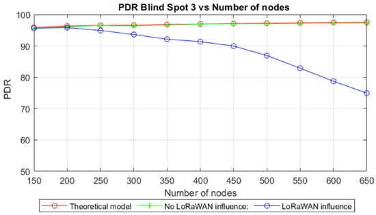 With the increase in the network density, the number of relaying nodes also increased, which entailed an increase in the transmission opportunities and, consequently, an increase in the PDR. The PDR remained above 95% in the three blind spots simulated in the scenario with 150 LoRaWAN nodes with a deterministic traffic characterized by a payload of 50 bytes and a transmission period of 15 min. However, when the density of the nodes increased significantly, the influence of the LoRaWAN traffic began to affect the performance of the network, causing the PDR to drop below 90% when the number of nodes exceeded 450, that is, when the network density was increased threefold. Therefore, we can conclude that the use of TSSFH in very-high-density LoRa-based WANs might reach moderate PDR values for nodes that are completely disconnected from the network in blind spots.