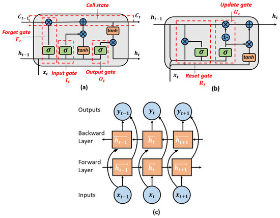 Long Short-Term Memory (LSTM): LSTM reminds the general RNN architecture and changes the memory cell unit structure, making it capable of storing extended time intervals. As shown in Figure 2a, input, output, and forget gates control the information flow within the memory cell. For a given input at specific time t, the corresponding output after passing the gates are: