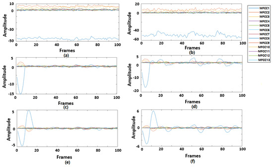 (a) MFCCs, (c) ∆MFCCs, (e) ∆²MFCCs for normal heart sound recording. (b) MFCCs, (d) ∆MFCCs, (f) ∆²MFCCs for abnormal heart sound recording.