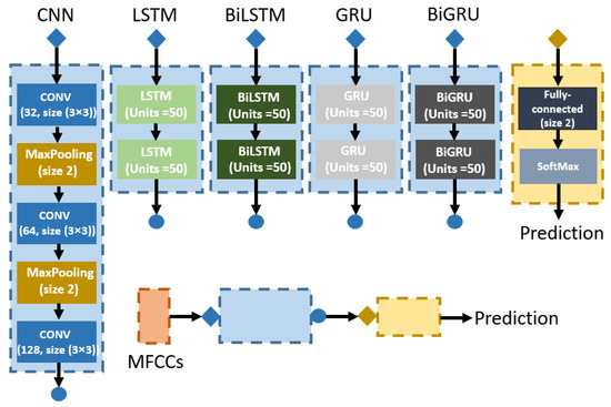 Another objective of this study is to compare the performance of deep learning models under similar conditions. Therefore, we built neural networks using different network structures, as shown in Figure 4. The overall design is MFCCs features input to the specific network module followed by a classification module to predict.