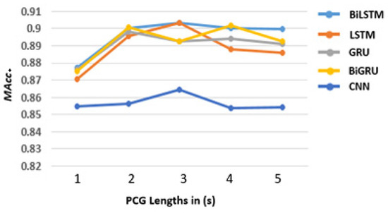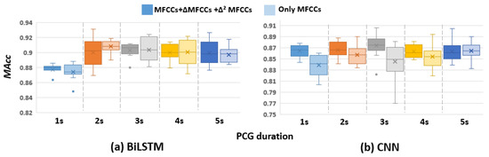 The performances (in MAcc) of the proposed models using MFCCs, ∆MFCCs, and ∆²MFCCs as input are shown in Figure 5. The RNN models (LSTM, GRU, BiLSTM, and BiGRU) showed an apparent increase between 1 and 2 s (from approximately 0.87 to 0.89), whereas there was no evident change trend between 2 and 5 s. Taking BiLSTM data as an example for statistical analysis, the p-value of 1 and 2 s is 0.017, and it is over 0.45 among 2 to 5 s, which proved that our finding is not random. However, on the CNN model, the effect of PCG duration is negligible from our results (p > 0.3 between different durations). Thus, we can conclude that the 1 s length PCG segment is unsuitable for training RNN models to classify heart sound, but it is acceptable for CNN models.