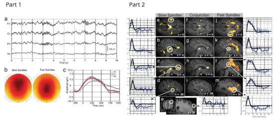 - Schabus, M.; Dang-Vu, T.T.; Albouy, G.; Balteau, E.; Boly, M.; Carrier, J.; Darsaud, A.; Degueldre, C.; Desseilles, M.; Gais, S.; et al. Hemodynamic cerebral correlates of sleep spindles during human non-rapid eye movement sleep. Proc. Natl. Acad. Sci. USA 2007, 104, 13164–13169. [Google Scholar] [CrossRef]