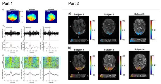 - Bonmassar, G.; Anami, K.; Ives, J.; Belliveau, J.W. Visual evoked potential (VEP) measured by simultaneous 64-channel EEG and 3T fMRI. Neuroreport 1999, 10, 1893–1897. [Google Scholar] [CrossRef]
