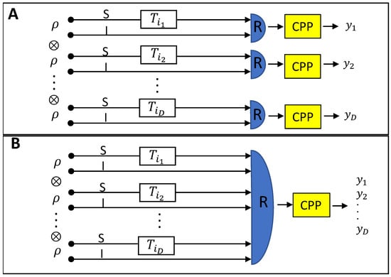 Memory readout scheme. (A) Local readout. A memory is depicted by an array of D cells, each represented by the transmittance , . is in general a random variable, but in the case of a perfect cell it reduces to a single parameter . A bipartite state is irradiated by a transmitter. The signal (S) system interacts with the memory cell while the idler (I) is sent directly to a local receiver (R) where it is measured jointly with the signal. The value of the bit is determined by classical post-processing (CPP) of the measurement result. (B) Global readout. If an array of length D (a memory) is tested in parallel, instead of cell by cell, D copies of are sent to the cells, one for each, and a joint measurement between all the copies is performed.