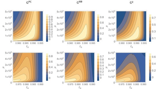 where , can represent each one of the three classical bounds defined in Equations (5), (7) and (10), in particular , and is the quantum gain w.r.t , and respectively. These quantities are reported in Figure 3 as a contour plot in function of the transmittance and the number of photons , while the other parameters are fixed. In the first row of Figure 3, the standard deviation of both distributions is fixed to which are small enough to reduce the initial overlapping. We see how the quantum gain in all three cases is relevant in most of the region analysed. The quantum strategy, based on photon counting measurement, performs very well against the same measurement strategy realized with classical probes, with the gain reaching values above 0.9 bits. Thus, the use of a quantum probe allows recovering almost all the information in a region where the same detection strategy with classical states would fail. A similar result is shown for the gain w.r.t. the optimal local classical bound, although with slightly lower gains, reaching a maximum of 0.8 bits. Even more remarkable it is the gain over the classical global limit, representing the bound on the information recovered per cell after a global measurement, which is significantly higher than zero in a wide region and reaches values higher than 0.7 bits per cell. This shows how the improvement offered by quantum correlation cannot be substituted by any, even not trivial, classical encoding over large memories. In all three panels, the range of transmittance showing a significant advantage is wider for small number of photons, where quantum fluctuations are more relevant. In the second row we show the effect of increasing the standard deviation to , leading to a larger overlapping between the initial distributions in the region explored. We see, in general, a reduction of the gain due to the initial ambiguity of the encoding that limit the value of accessible information to a value lower than 1 bit and consequently the space for quantum advantage.